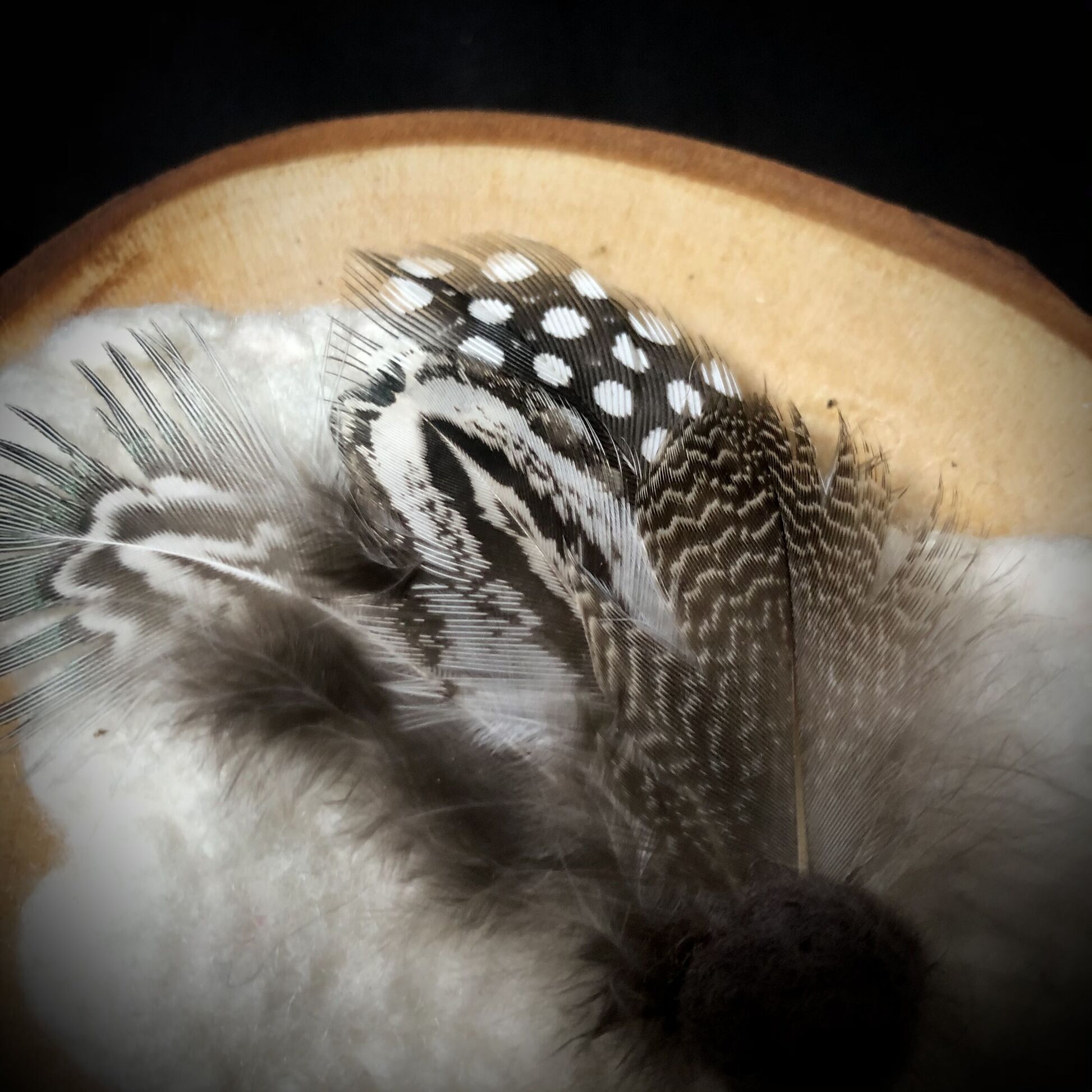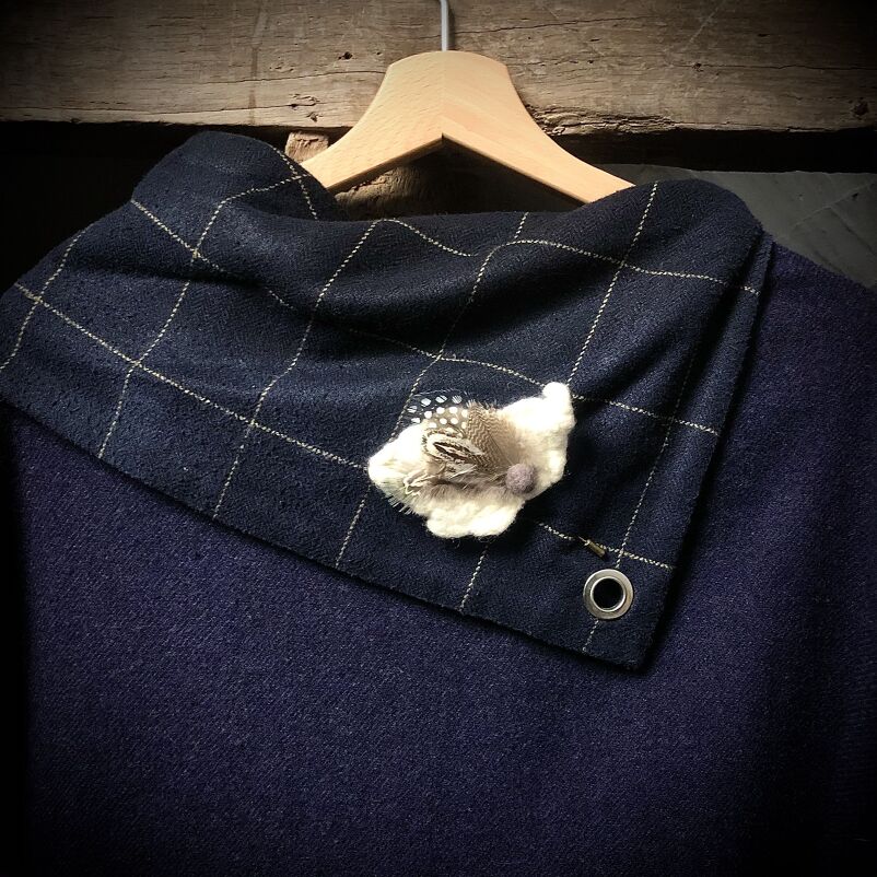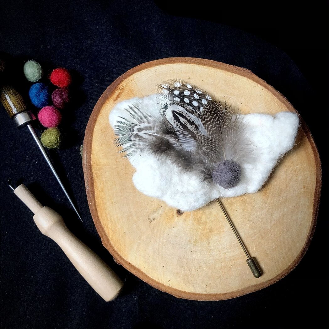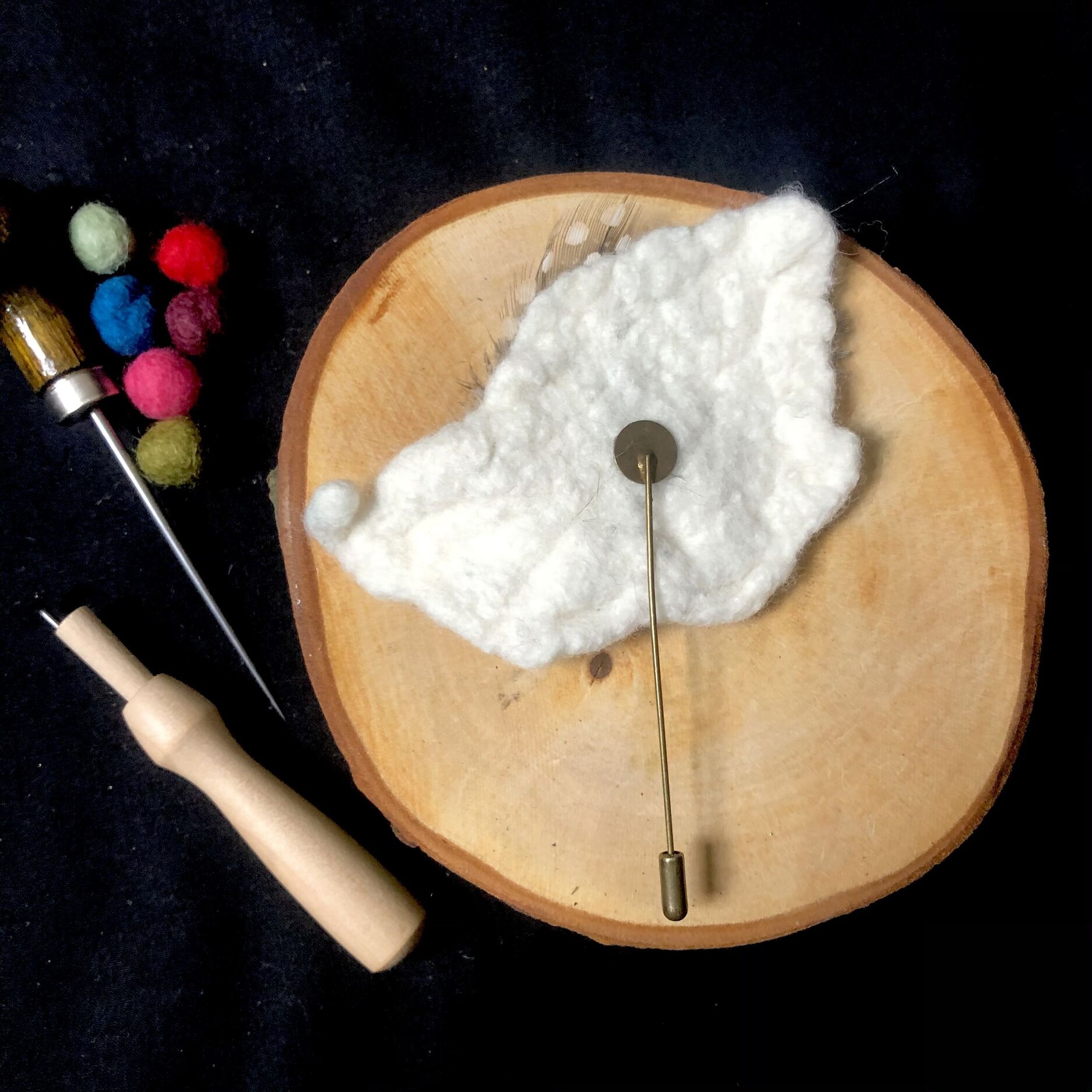 The beautiful White Spotty Stick Pin is hand-felted using white merino wool roving and carefully sourced feathers.