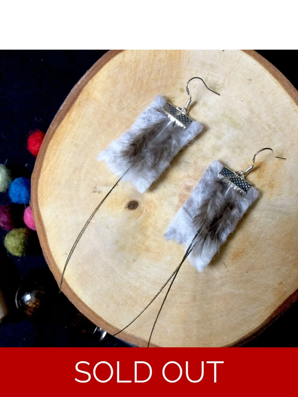 These beautiful earrings are made from hand felted, grey and white merino wool roving, with carefully sourced grey fluffy down feathers coupled with peacock flue.